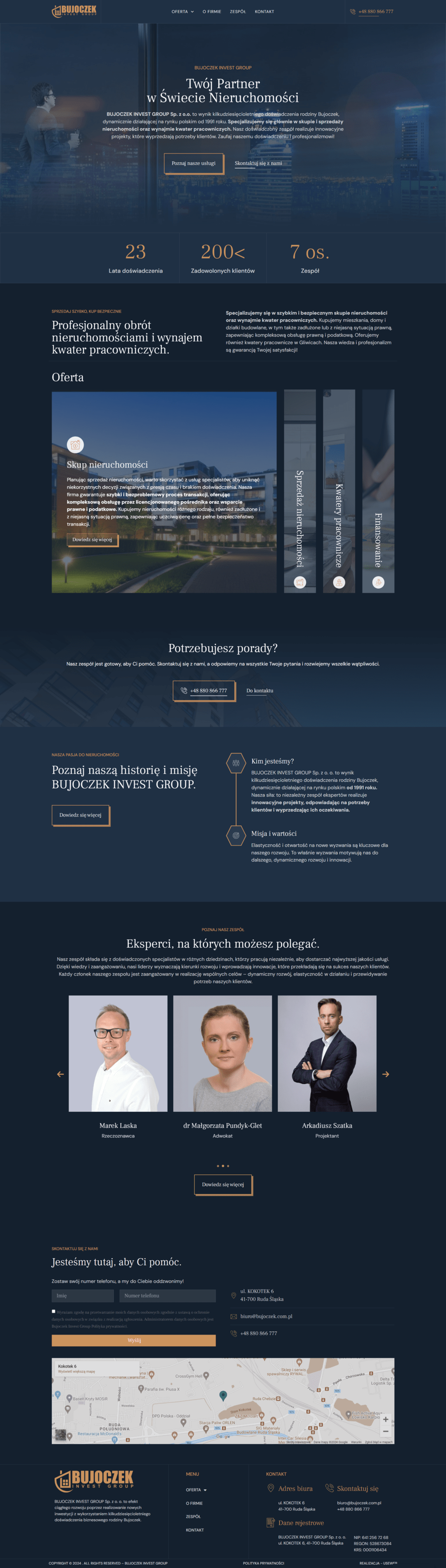 Thanks to its responsive design, the site operates reliably across various devices, offering ease of use and comfort. The elegant and modern design reflects the prestige of the Bujoczek Investment Group, attracting the attention and interest of potential clients. We focused on creating an intuitive user pathway that not only increases visitor engagement but also translates into tangible business benefits for our client. Additionally, we implemented a contact form and interactive elements such as pop-ups to facilitate communication and enrich the user experience.