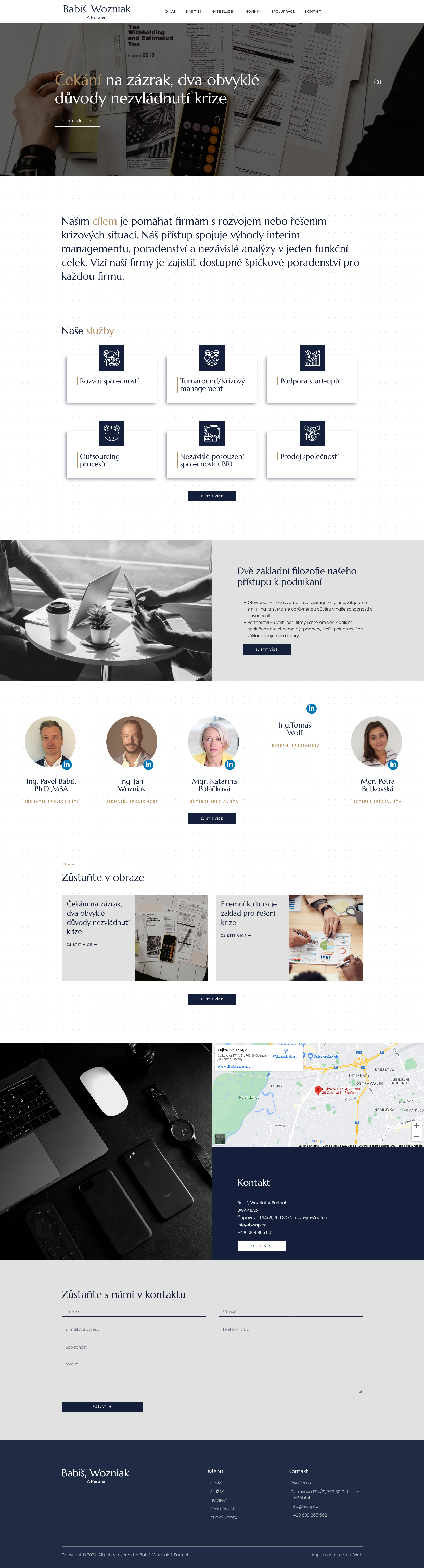 For Babiš, Wozniak A Partneři, we created a responsive website using CTAs to attract customers and facilitate their contact with the company. The graphic design was designed in a clear and user-friendly manner, and RWD ensures compatibility with various devices. The site presents the services offered in an aesthetically pleasing way, contributing to a positive reception by customers and improving search engine positioning.