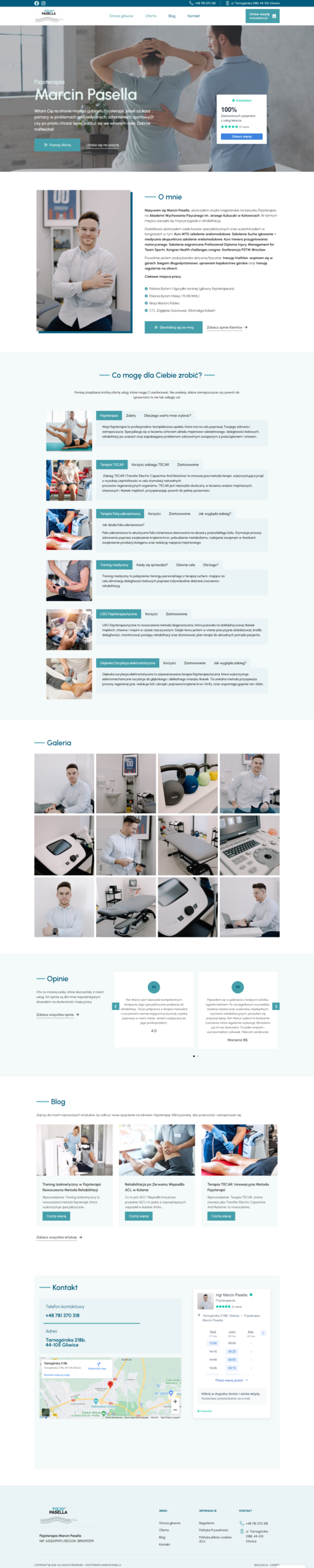 The site provides detailed descriptions of services such as TECAR therapy, shockwave therapy, physiotherapeutic ultrasound, and medical training. Intuitive contact forms allow users to easily schedule appointments, and a section with customer reviews builds trust in the brand. A regularly updated blog provides valuable information on health and rehabilitation, and a gallery visually presents therapy methods and the clinic’s interior.